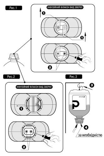 - Інший стерильний порт може використовуватись для введення в інфузійний флакон інших лікарських засобів (№ 4, див. рис. 3), або, у разі недостатньої швидкості потоку для голки-повітровода (№ 4, див. рис. 3).